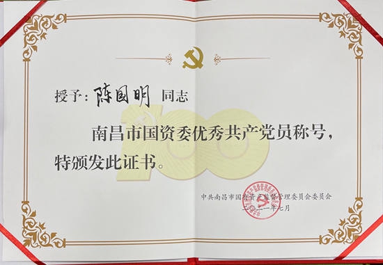 在隆重紀念中國共產黨成立100周年之際,南昌市國資委和南昌旅游集團于近日對一批來自各條工作戰線上的優秀黨員和優秀黨務工作者及先進基層黨組織進行了表彰,獎勵他(她)們在各自的工作崗位上履職盡責創先進、立足崗位爭優秀,在推動企業高質量發展中充分發揮戰斗堡壘和先鋒模范作用。其中,公司陳國明同志榮獲市國資委“優秀共產黨員”稱號,公司黨委被評為南旅集團“先進基層黨組織”,黨員職工胡穎明、徐小蘭、王昕、王貞同志獲南旅集團“優秀共產黨員”稱號。